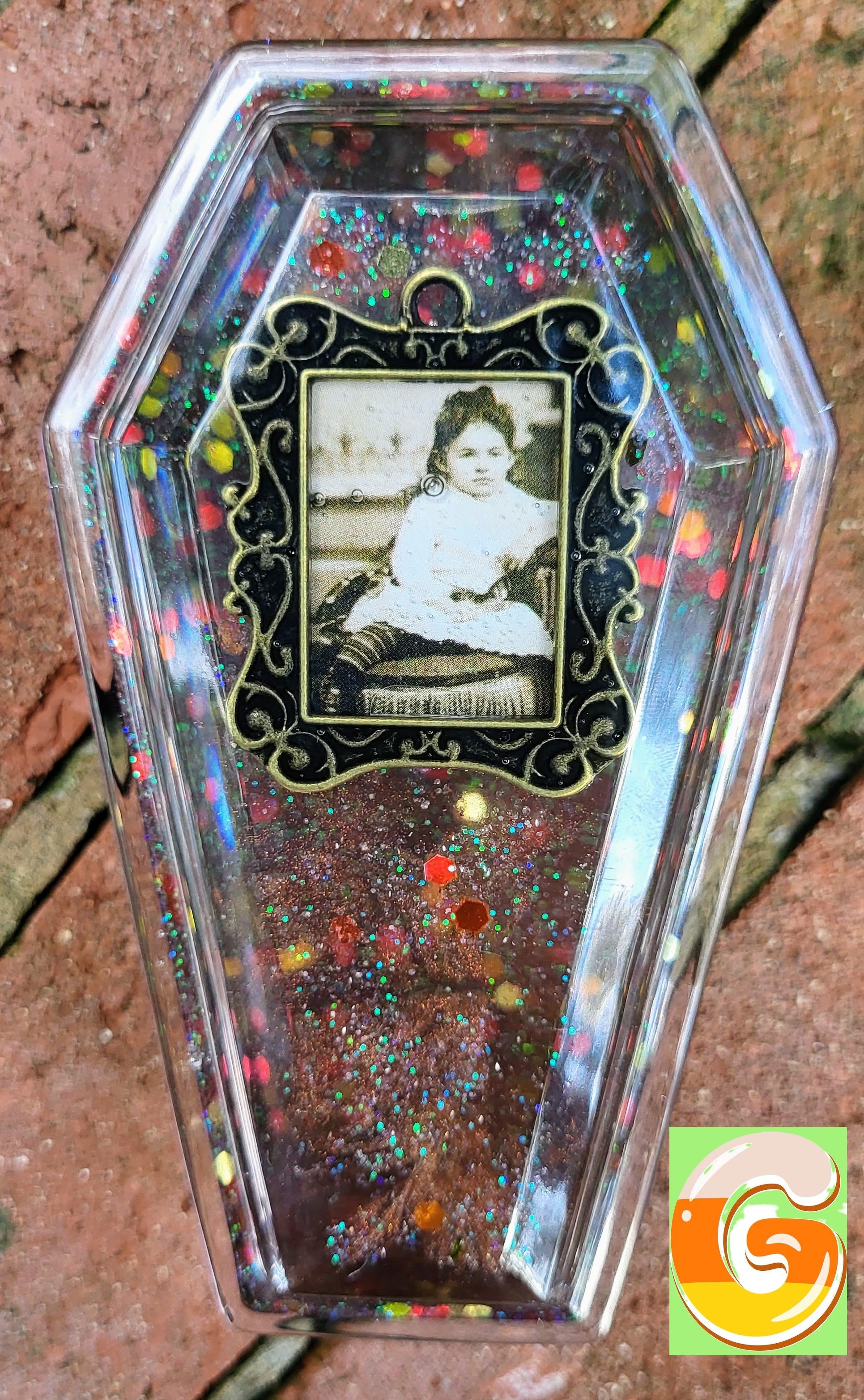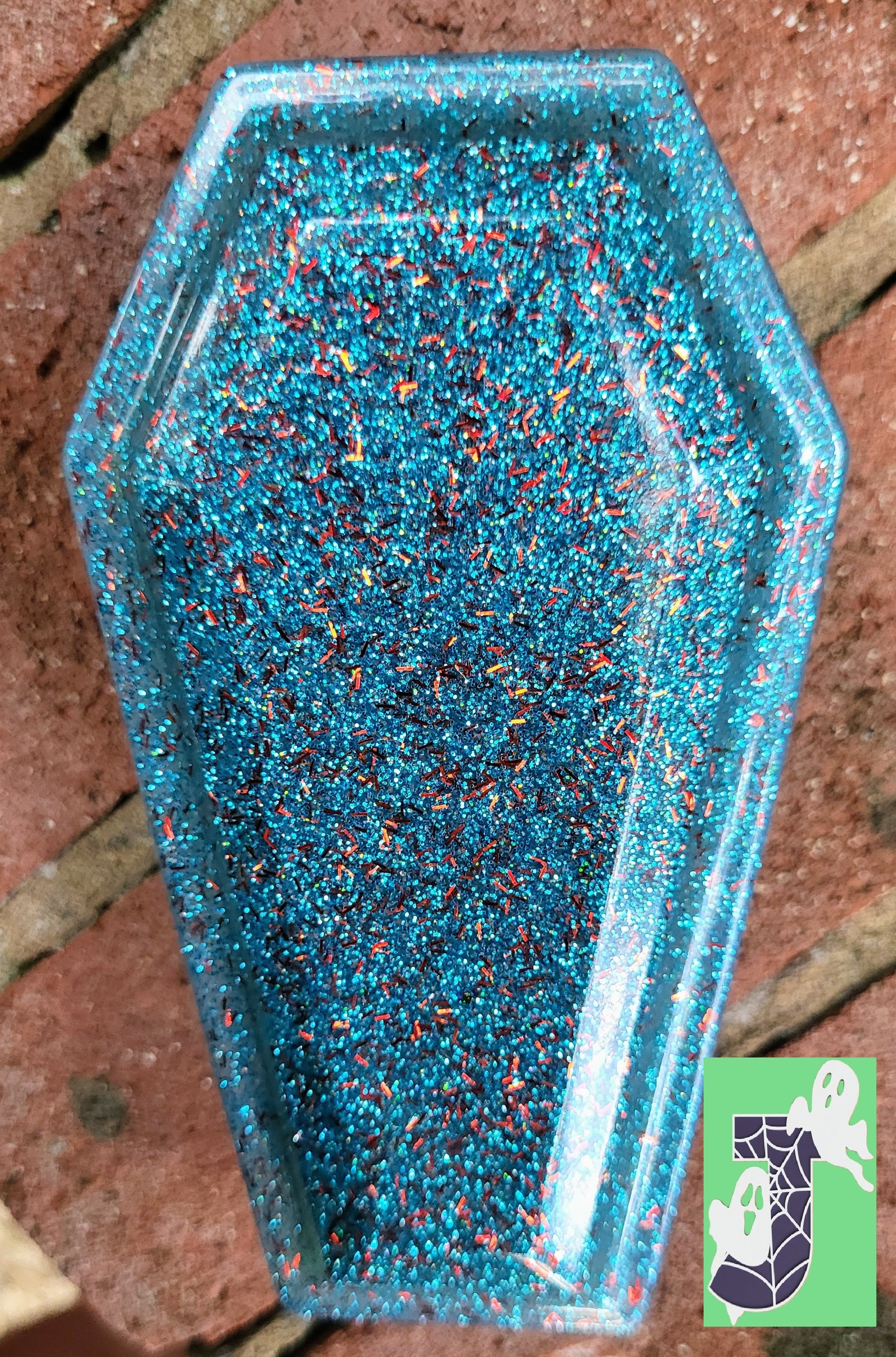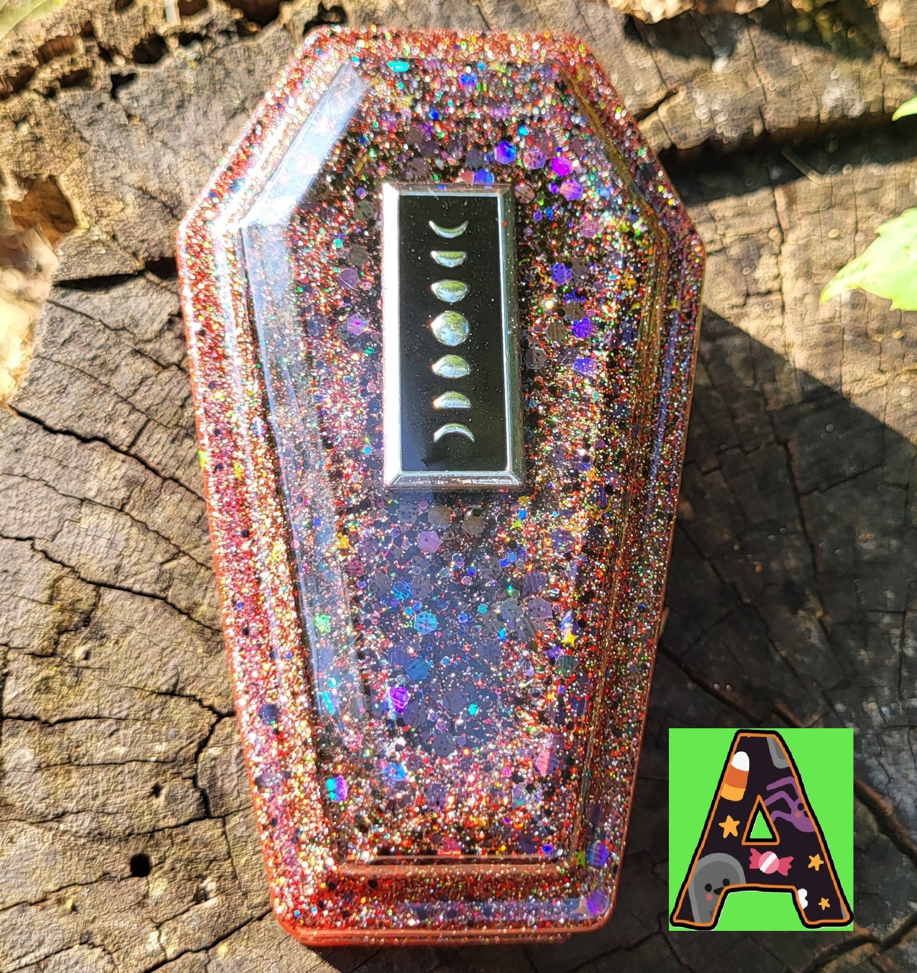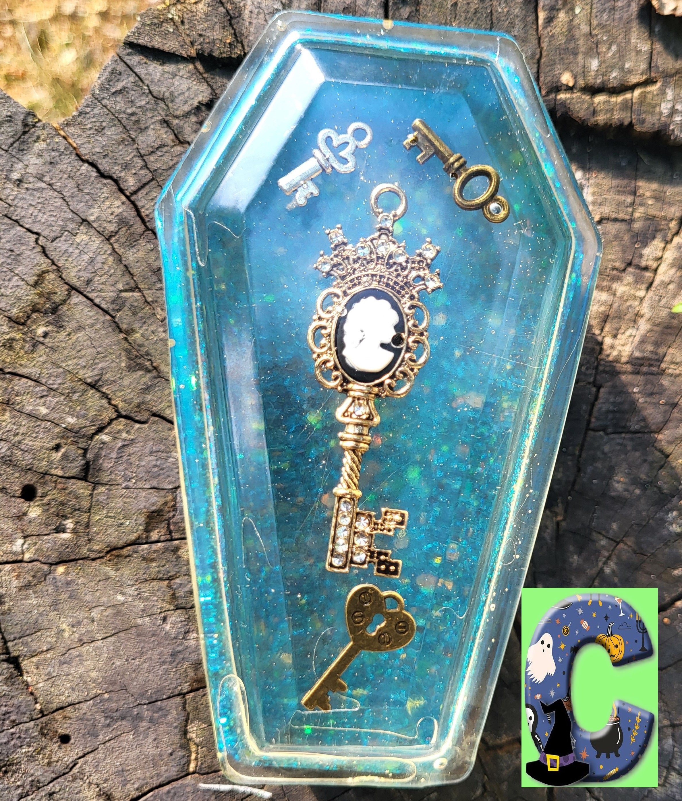 Looking for a spooky and cute way to store your jewelry? Check out this coffin jewelry box made from resin. It's the perfect combination of creepy and adorable. Get yours today! This coffin box has a little scene on the inside and it is two-toned and absolutely beautiful.